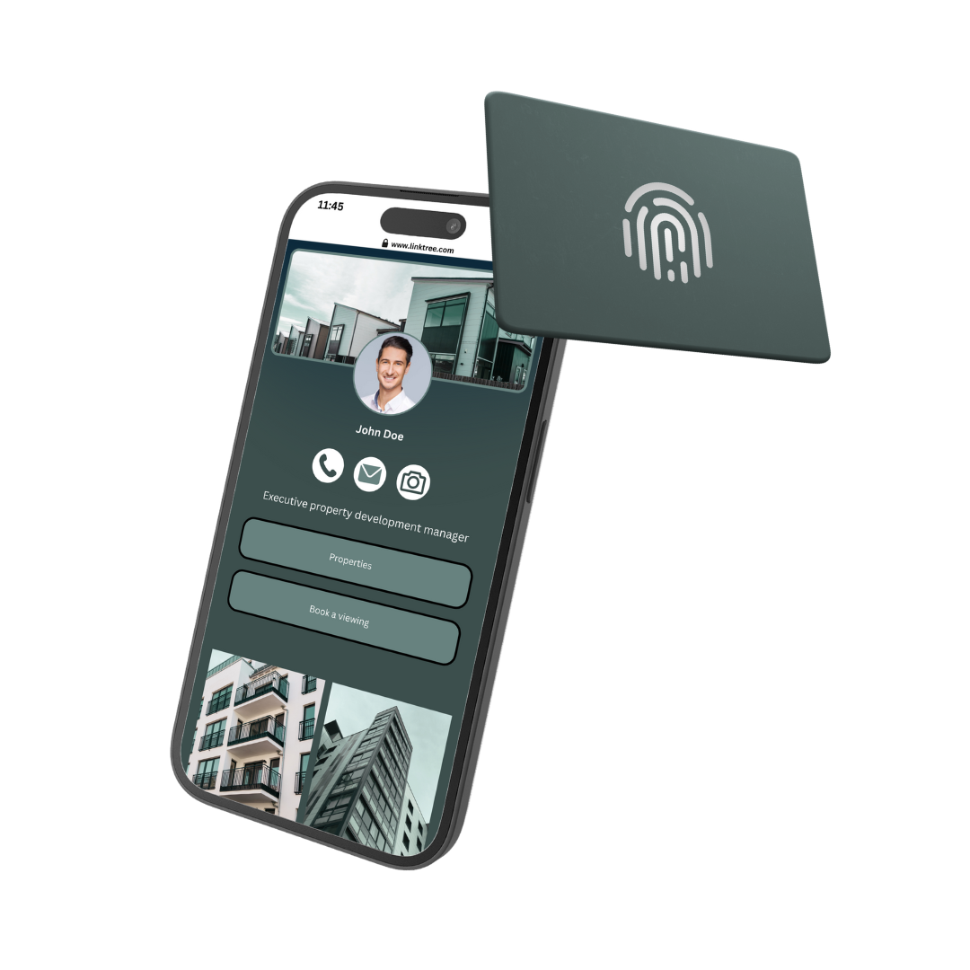 NFC stands for “near field communication”, meaning your card can communicate directly to the chip in a smartphone. You can add your contact details, website links and social media accounts to your card and instantly share them with just a tap!